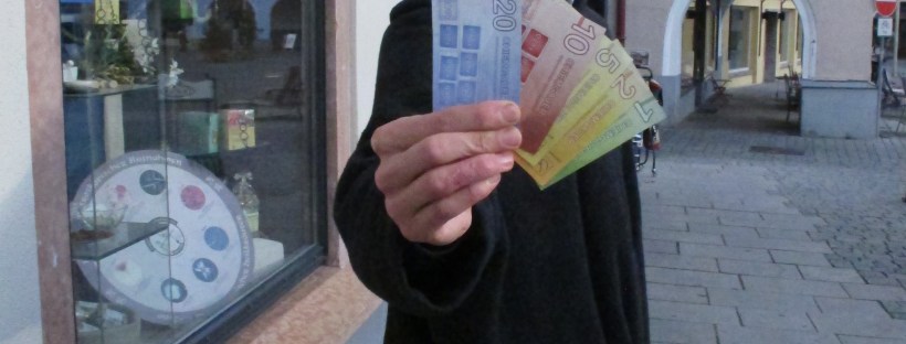 Alternatives Wirtschaften? Regionalgeld? Was ist das eigentlich? – Regionalgeld auch Regionalwährung oder Lokalwährung genannt, ist eine Währung, die innerhalb einer begrenzten Region als Zahlungsmittel verwendet wird. Weltweit gibt es mehrere hundert Regionalwährungen mit unterschiedlichen Konzeptionen und Ausprägungen. In Deutschland ist der Chiemgauer die größte Regionalwährung mit einer Verbreitung in den Landkreisen Rosenheim und Traunstein. Das Ziel von Regionalwährungssystemen ist es, die regionale Wirtschaft zu fördern und zu stabilisieren. Durch den kleinen Raum, in dem das Regioalgeld verwendet wird, bleibt die Kaufkraft für damit getätigte Geschäfte in der Region, statt ins Ausland oder in Finanzmärkte abzuwandern. Initiatoren einer Regionalwährung erhoffen sich die Stärkung der regionalen Vernetzung und einen direkteren Kontakt zwischen Herstellern und Endverkäufern und letzlich auch eine Belebung der Wirtschaft vor Ort.