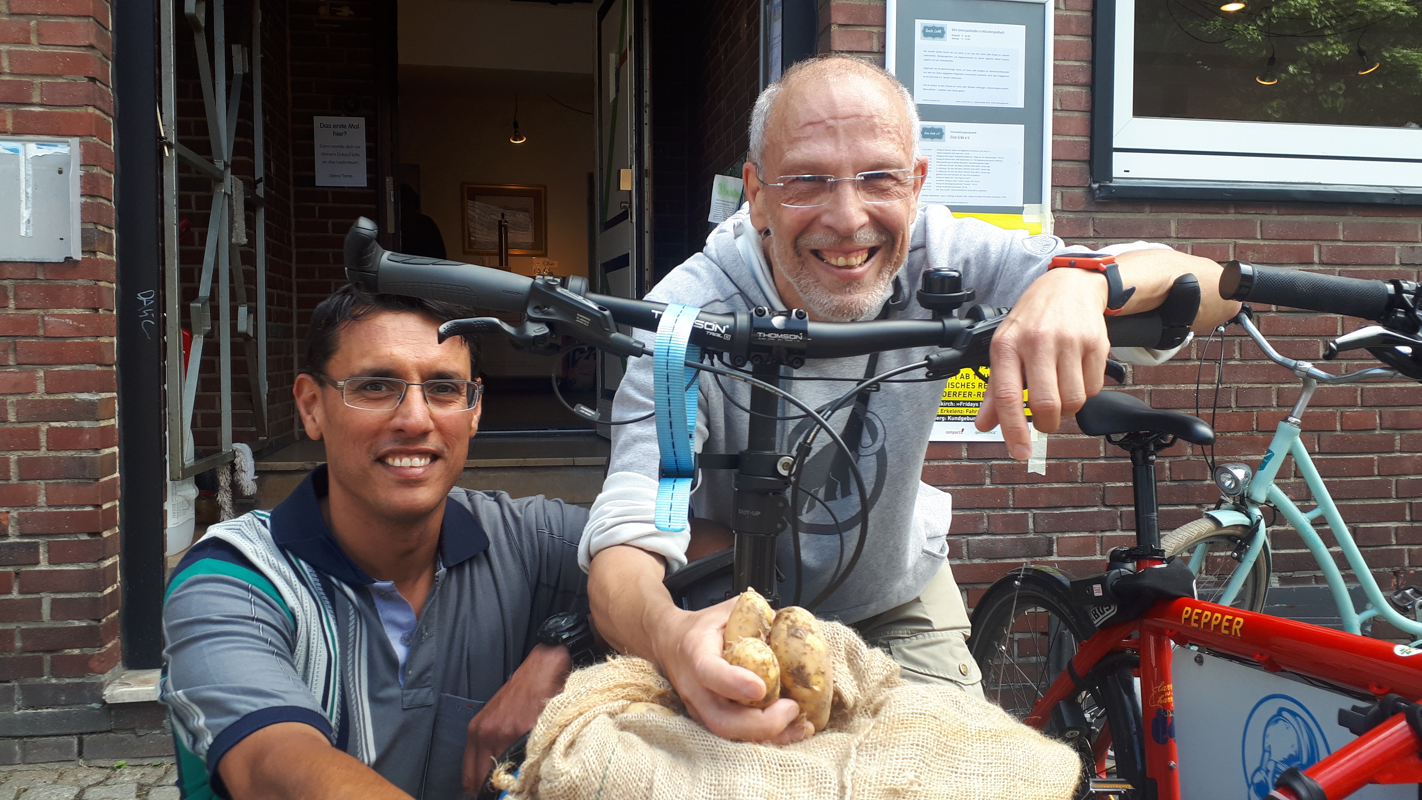 Unsere Kartoffelhelden: Florian (l) und Klaus (r) vom ADFC mit Annabelle (Mitte), unserer Frühkartoffel. Der Transport erfolgt mit Lastenrädern.