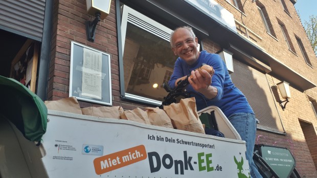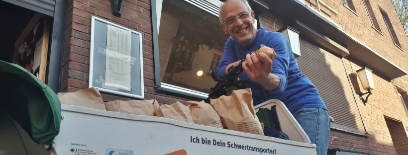 Für eine kleine Überraschung sorgt Klaus Heimbucher vom ADFC, als er uns am Montag die Zwiebeln frisch vom Feld in unseren kleinen Laden bringt: Mit einem Donk-EE schwebt er an, einem E-Lastenrad von Riese & Müller, das sein zu Hause eigentlich in Köln hat. Donk-EE ist dort nämlich das erfolgreiche Lastenrad-Verleihsystem, welches 60 Lastenräder per App 24 Stunden den Kölner*innen zur Ausleihe zur Verfügung stellt. Davon können Mönchengladbacher*innen nur träumen, doch gibt es immerhin mehrere Lastenräder vom ADFC zur Ausleihe, die von ADFC-Mitgliedern kostenlos geliehen werden können.