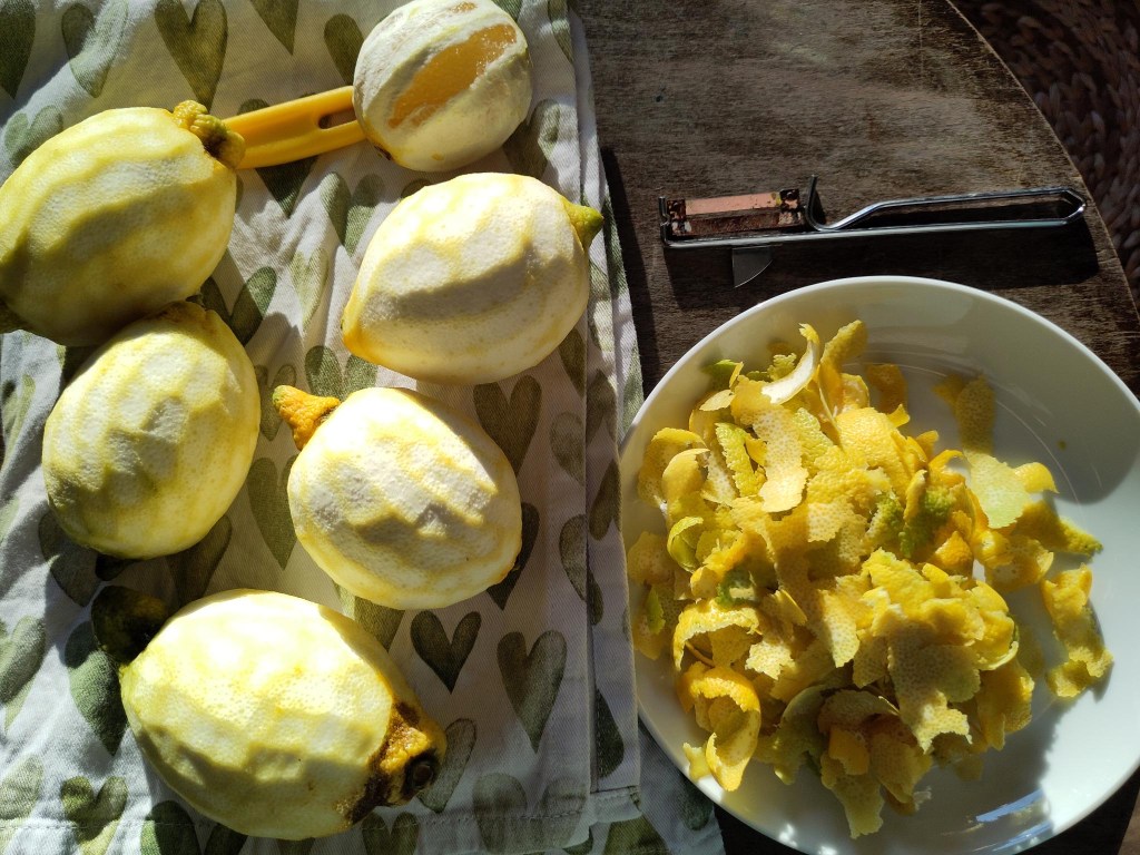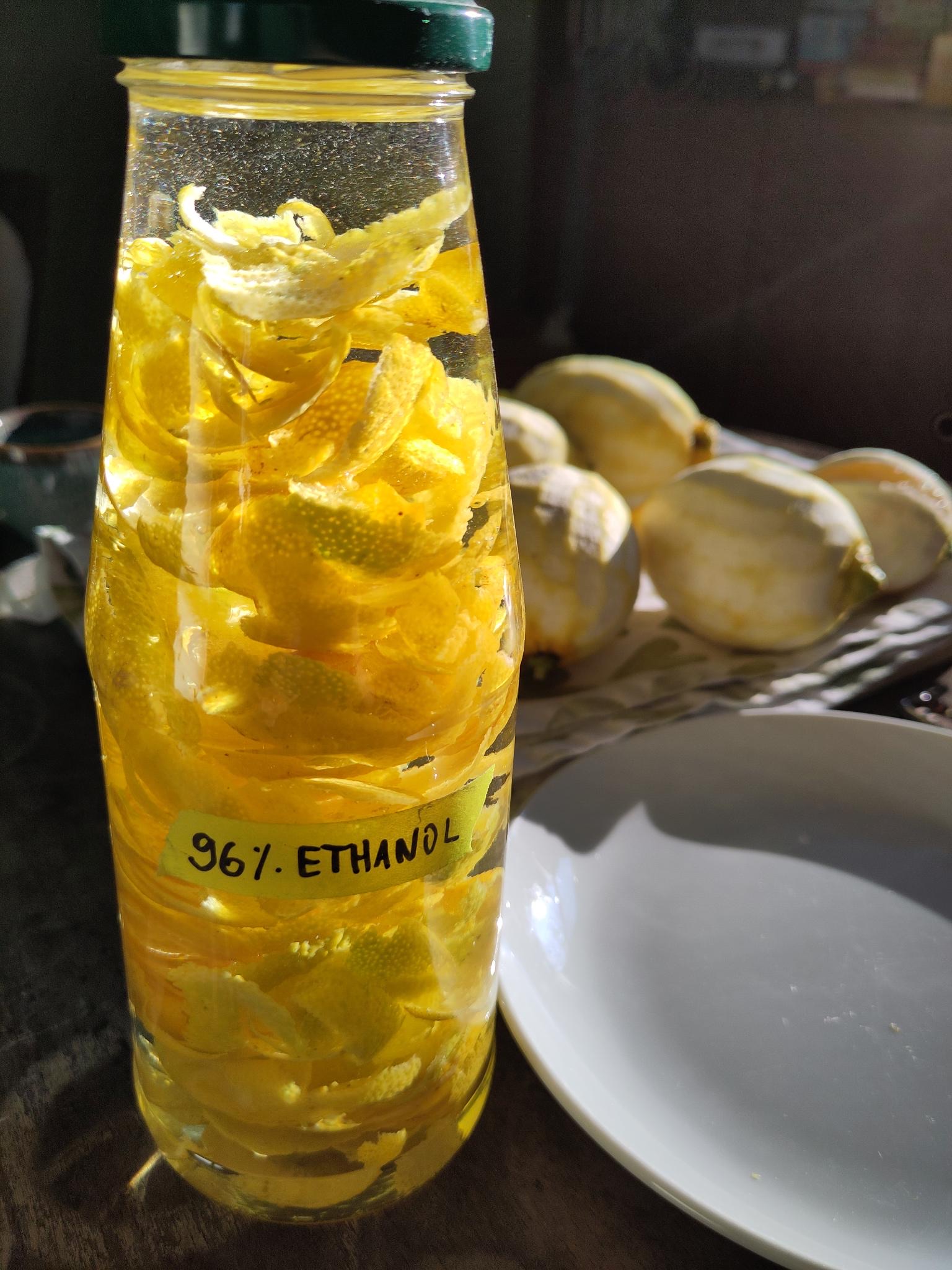 Ihr braucht: 500 ml Alkohol 96% vol. 800 ml Wasser 400 g Vollrohrzucker 6 Bio Zitronen